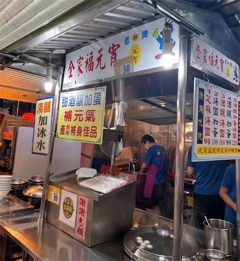 台湾には客家の人たちがよく食べる肉餡で野菜スープに入っている元宵(あるいは湯圓)もあるんだけど、ここのは中国に広くあるごま団子入りの元宵で、金木犀のシロップに入ったもの以外に、酒釀(甘酒のようなもの)の甘酸っぱいスープに入っているものもある。